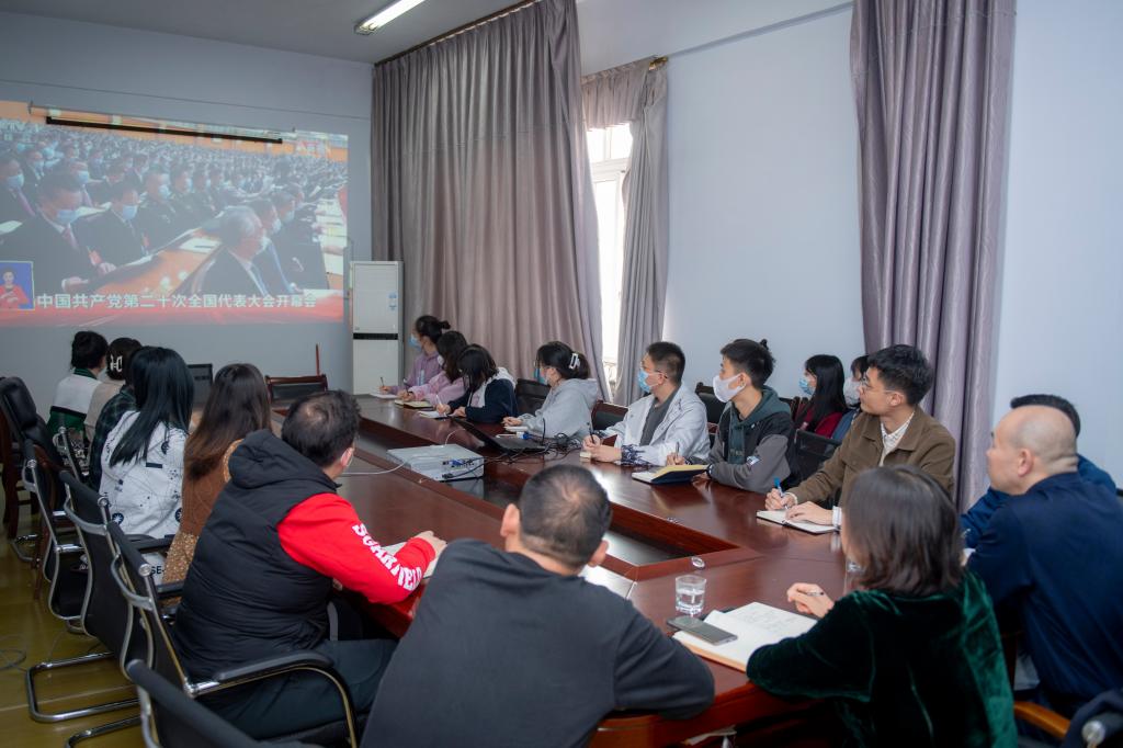 上午10时,420会议室中座无虚席、鸦雀无声,只响彻着高亢洪亮的国歌。康养产业·医学院师生代表全神贯注地观看着中国共产党第二十次全国代表大会。