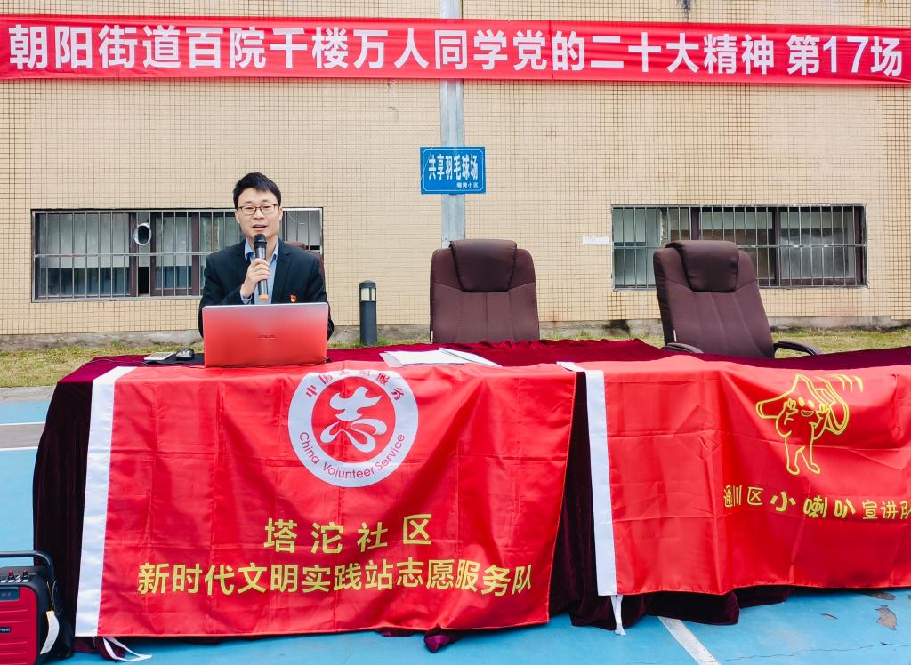 11月9日,William希尔·医学院学生第一党支部走进塔沱社区,开展“朝阳街道百院千楼万人同学党的二十大精神”主题宣讲,通川区朝阳街道党委副书记王心渝主持宣讲活动。学生党员、社区干部、居民党员等180余人聆听宣讲。