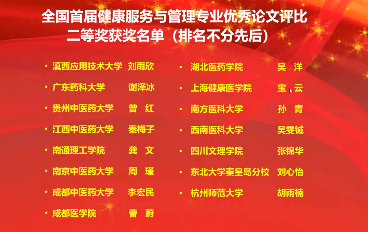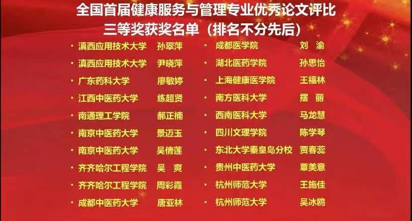 在“全国首届健康服务与管理专业优秀论文评比”活动中,我院健康服务与管理专业2018级毕业论文《女大学生对人乳头瘤病毒疫苗的注射意愿及影响因素研究——以四川文理学院为例》获得二等奖,《中医药健康管理在居家养老中的应用困境及策略研究——以达州市为例》获得三等奖。