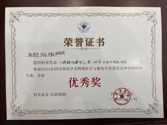 11月10日,由四川省医学会物理医学与康复专业委员会举办的科普大赛在四川眉山圆满落幕。大赛共汇聚了来自全省的28个优秀作品,经过专家评审的严格筛选和现场评比,我院2022级康复治疗学专业学生组成的代表队,凭借科普作品《破解网球肘之困:科学认知与有效治疗》荣获优秀奖,充分体现了学院在康复教育领域的教学成果和社会影响力。